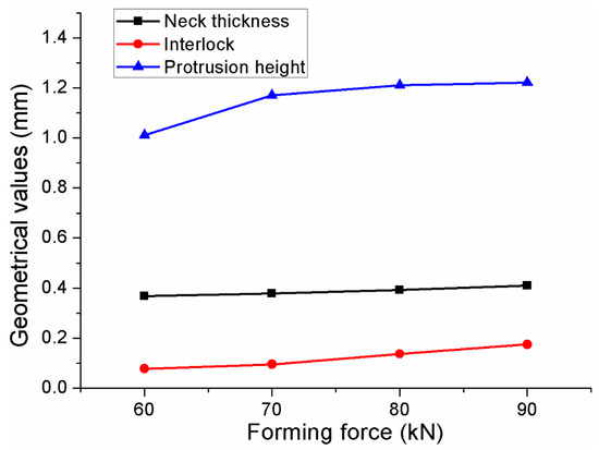 When the forming force was set to 40 or 50 kN, there was no mechanical interlock generated between the sheets, and the improved clinched joint was not produced. Thus, only the improved clinched joints with different forming forces of 60, 70, 80, and 90 kN are considered in the following study.