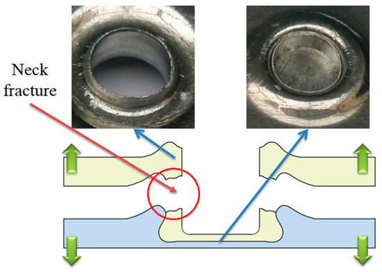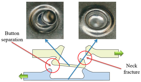 There are three main failure modes in the process of failure: neck fracture mode, button separation mode, and mixed failure mode [56,57]. When the upper sheet is separated from the other sheet, this failure mode is called button separation. When the neck is fractured in the process of failure, the failure mode is called neck fracture. Mixed failure mode is a combination of neck fracture mode and button separation mode. The fracture modes of the improved clinched joint are similar with the conventional clinched joint.
