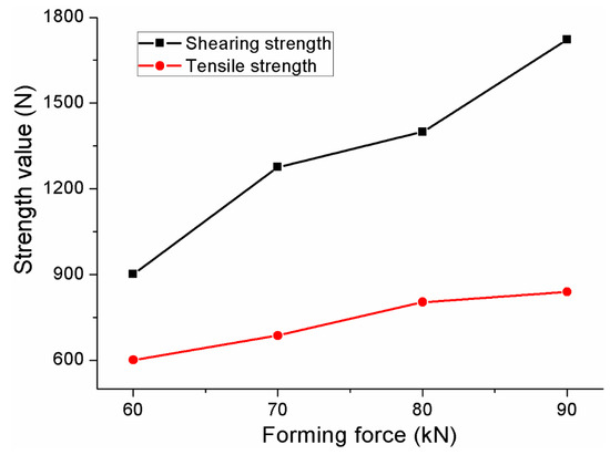 The static shearing and tensile strengths of the improved clinched joints with forming forces between 60 and 90 kN are shown in Figure 15. The improved clinched joint with a forming force of 60 kN has the lowest shearing and tensile strength, while the improved clinched joint with a forming force of 90 kN has the highest shearing and tensile strength. The shearing strength of improved clinched joint with a forming force of 90 kN was 91.1% higher than that with a forming force of 60 kN, and the tensile strength of the improved clinched joint with a forming force of 90 kN was 39.6% higher than that with a forming force of 60 kN. The shearing and tensile strength could be increased markedly by increasing the forming force.