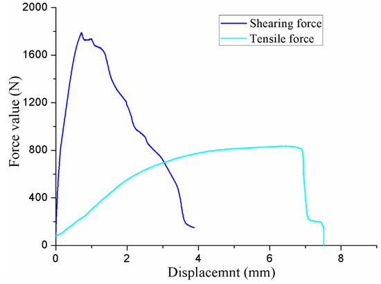 The improved clinched joint with a forming force of 90 kN had the highest shearing strength and tensile strength in this study. The shearing and tensile force-displacement curves with a forming force of 90 kN are drawn in Figure 16. The shearing force curve is on the rise with the increase of the shearing displacement before the maximum force value, while the shearing force curve is decreased gradually with the increase of the shearing displacement after the maximum force value. Before the maximum force value, the tensile force curve was gradually on the rise with the increase of the tensile displacement. After the maximum force value, the tensile force curve dropped suddenly.