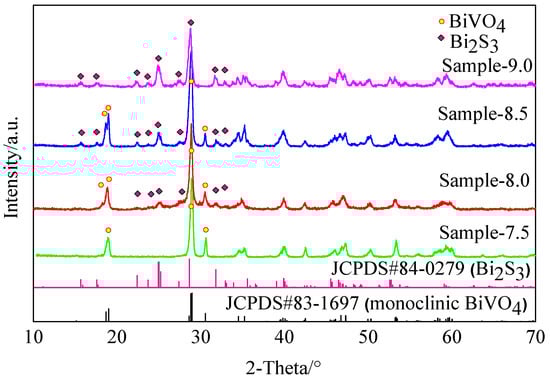 When the synthesis reaction was performed in a pH solution of 7.5, the XRD diffraction pattern of the resulting sample was similar to that of monoclinic BiVO4 (yellow line in Figure 1 JCPDS#83-1697) [25], indicating that the sample was monoclinic BiVO4. In contrast, the XRD diffraction peaks of samples 8.0 and 8.5 showed characteristics of both BiVO4 and Bi2S3 (JCPDS#84-0279) [26]. As the pH increased, the Bi2S3 peak increased in both height and intensity. However, when the pH of the precursor solution was 9.0, only Bi2S3 was obtained. Therefore, the SEM, XPS, and TEM results indicate that a Bi2S3/BiVO4 heterojunction may be synthesized when the reaction was performed under a pH of 8.0 or (and) 8.5.