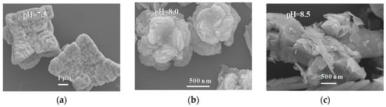 The pH of the reaction solution was set to 7.5, 8.0, 8.5, or 9.0 (Sample-7.5, Sample-8.0, Sample-8.5, and Sample-9.0, respectively). During synthesis, 2 mmol Bi(NO3)·5H2O and 0.6 mmol l-cysteine were dissolved in 4 mL of 4 mol/L HNO3. Then, 50 mL of deionized water was added to the solution, and the mixture was stirred for 30 min to obtain solution A. Similarly, 2 mmol NH4VO3 was dissolved in 4 mL of 2 mol/L NaOH, and the mixture was stirred for 30 min to obtain solution B. Solutions A and B were mixed together, and the pH was adjusted to 7.5, 8.0, 8.5, or 9.0 using NaOH or HNO3. The solutions were transferred into a 100-mL, Teflon-lined autoclave, heated at 180 °C for 16 h, and allowed to cool to room temperature. Finally, the solutions were centrifuged to obtain the final products. The samples were rinsed with distilled water and ethanol six times, and the pH of the filtrate was measured after the last rinse. If the pH of a sample was not neutral, the sample was further rinsed until a pH of ~7 was obtained. Then, the products were dried at 60 °C for 12 h in vacuum.