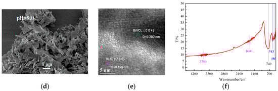 According to the SEM images (Figure 2), sample 7.5 was cube-like in shape, with a length of about 5 μm, whereas sample 8.0 consisted of concentric layers, with some Bi2S3 particles dotting the outer layers. Sample 8.5 mainly consisted of BiVO4 shaped as hexagonal pyramids and some flakes of Bi2S3. Sample 9.0 consisted of only Bi2S3 flakes. Therefore, the pH of the precursor solution strongly influenced the prepared products. Characteristic stripes of BiVO4 (004) [27] and Bi2S3 (200) [28] can be observed from the HRTEM results (Figure 2e). Figure 2f shows the FT-IR spectra of sample 8.0. The broad absorptions at 740 cm−1 can be attributed to BiVO4 [29]. Furthermore, absorption at 543 cm−1 and 486 cm−1 can be ascribed to Bi2S3 [30], whereas the broad and weak peaks around 3700 cm−1 and 1600 cm−1 are due to the vibrational rotation and bending deformation of very small amounts of water molecules in the sample [31]. These results show that the heterojunction was successfully prepared when the pH of precursor solution was 8.0.