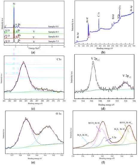 Energy dispersive X-ray detector (EDX) spectra of all samples (a) and X-ray photoelectron spectra (XPS) spectra of Sample-8.0 (b–f): (b) survey XPS spectrum, (c) C 1s peaks, (d) V 2p3/2 and V 2p1/2 peaks, (e) O 1s peak, and (f) Bi 4f5/2, Bi 4f7/2 and S 2p peaks.