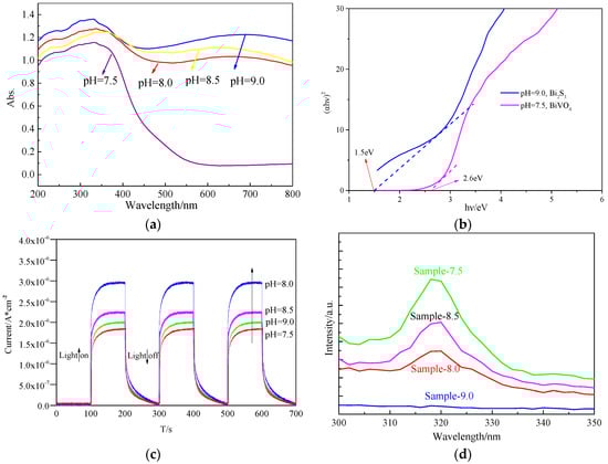 Photoelectrochemical tests were conducted to analyze the excitation, separation, and transfer of carriers in the catalyst. Photoanodes were prepared by electrophoretic deposition on ITO glass supports. The electrophoretic deposition was carried out in an acetone solution (20 mL) containing iodine (50 mg) and photocatalyst powder (50 mg), and then dispersed via sonication for 5 min. The ITO electrode (1.0 × 2.0 cm2 was immersed in the solution with a Pt electrode, and a 30 V differential was applied for 100 s using a potentiostat. After this process was repeated twenty times, the electrode was dried and calcined at 200 °C for 2 h. The exposed effective area of the ITO glass was controlled to be 1.0 × 1.0 cm2. According to the transient photocurrent responses of the samples under visible irradiation (Figure 4c), the photocurrent of sample 8.0 had the highest density, followed by sample 8.5, sample 9.0, and finally sample 7.5. The PL spectra (excitation wavelength of 280 nm) are shown in Figure 4d. The characteristic peak of bismuth vanadate is visible at 320 nm [45]. No peak was visible in sample 9.0 owing to the presence of bismuth sulfide. In contrast, sample 7.5 had the strongest peak, followed by sample 8.5, and sample 8.0. This is because sample 8.0 contained a Bi2S3/BiVO4 heterojunction, which is conductive to the separation of electron–hole pairs. Sample 8.5 was produced by physical contact of Bi2S3 and BiVO4. Sample 9.0 contained Bi2S3, but even though this catalyst can almost completely absorb visible light, the recombination of electrons and holes may occur due to the narrow band gap. Sample 7.5 contained BiVO4, which has a limited visible absorption range. Therefore, sample 8.0 displays the strongest potential for use in photoelectric and environmental applications.