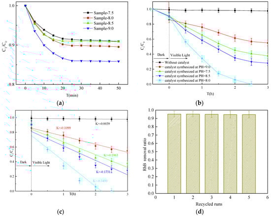 The photocatalytic activity of samples was evaluated under visible radiation at room temperature by measuring the degradation rate of RhB. For the experiments, 0.20 g of catalyst was added to 200 mL of 5 mg/L RhB aqueous solution, and the mixture was stirred for 30 min in the dark to achieve adsorption–desorption equilibrium between the dye and the catalyst. The experimental solution was placed 350 mm from the 500-W Xe lamp (with a <400 nm UV cutoff filter). Samples were collected after every 0.5 h of irradiation, and then centrifuged (10,000 r/min) to remove the catalyst. Subsequently, the absorbance of the solution at 552 nm was measured to indicate the concentration of the remaining dye. For comparison, the photocatalytic experiments were conducted with Samples 7.5, 8.0, 8.5, and 9.0 as catalysts, and with no catalyst.