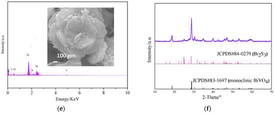 Figure 5a shows the results of the adsorption–desorption equilibrium tests. The samples were collected once every 5 min during the dark reaction stage. The RhB concentrations of the various solutions stabilized over time. Dyes and catalysts reached adsorption–desorption equilibrium after stirring for 30 min in the dark. Figure 5b shows the photocatalytic activities of the samples under visible irradiation for 3 h, and the corresponding degradation kinetics constants are shown in Figure 5c. For comparison, the RhB degradation rate was also estimated with no catalyst. The results indicate that 45.07%, 62.13%, 72.00%, and 100.00% of the RhB was degraded when samples 9.0, 7.5, 8.5, and 8.0 were used as catalysts, respectively. This indicates that sample 8.0 has the highest catalytic activity, followed by sample 8.5, sample 7.5, and sample 9.0. Sample 8.0 can be easily recycled by simple filtration, and its degradation effect was respectively maintained at 95.19%, 95.18%, 94.91%, 94.64%, and 94.63% after five recycling cycles (Figure 5d). The EDX, SEM, and XRD results for sample 8.0 after five recycling cycles indicated that no leaching of elements occurred and the morphology remained unchanged (Figure 5e,f). This indicated that sample 8.0 has an excellent heterostructure. Furthermore, the Bi2S3 dots were very small (19.7 ± 2.2 nm, calculated based on the Sherer relation); thus, the specific surface area of the sample was larger than that of pure BiVO4 (Table 2). The specific surface area of samples 7.5, 8.0, 8.5, and 9.0 was 6.423, 19.527, 12.642, and 21.165 m2 g−1, respectively, indicating that Bi2S3 greatly impacted the specific surface area of the samples. The formation of the heterojunction, and the greater specific surface area of BiVO4 of sample 8.0 improved its photocatalytic activity. These features are very important for its practical application and modification.