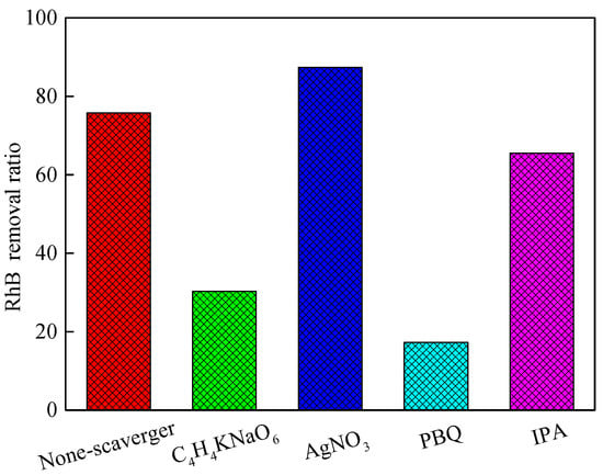Active species such as ·O2−, ·OH, e−, and holes(h+)play an important role in the photodegradation of dyes [49]. To investigate the photocatalytic mechanism and activity of Bi2S3/BiVO4, the contribution of each active species to the photodegradation performance was examined based on a scavenger experiment [50]. In this experiment, potassium sodium tartrate (C4H4O6KNa·4H2O, 0.1 mmol) was used as the h+ scavenger, silver nitrate (AgNO3, 0.1 mmol) was used as the e− scavenger, p-benzoquinone (PBQ, 0.1 mmol) was used as the ·O2− scavenger, and isopropanol (IPA, 0.1 mmol) was used as the ·OH scavenger. These scavengers were added to RhB solutions containing Bi2S3/BiVO4, and the solutions were irradiated with visible light for 1.5 h. According to Figure 6, the addition of the h+ scavenger (C4H4O6KNa) and the ·O2− scavenger (IPA) severely suppressed the catalytic performance, suggesting that h+ and ·O2− are the main reactive species contributing to the photodegradation of RhB. After the addition of the ·OH scavenger (IPA), the catalytic degradation effect was slightly inhibited, which suggests that ·OH plays an insignificant role in this reaction system. The ·OH was mainly produced by oxidation of H2O to ·O2− and OH− through BiVO4 VB [1]. Lizhen Ren et al. reported that the VB of Bi2S3 was not sufficient to oxidize OH− to ·OH [51]. After adding the e− scavenger (AgNO3), the degradation efficiency increased owing to e− consumption and increased h+ efficiency; therefore, h+ plays the most important role in this degradation process and can directly degrade dyes [1,49].