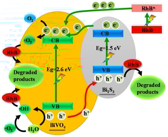 The scavenger experiments confirmed the existence of ·O2−, ·OH, e−, and h+ in the catalytic system. A thorough understanding of the photocatalytic degradation mechanism is necessary for the actual application of Bi2S3/BiVO4 heterojunctions. The postulated degradation mechanism is shown in Schematic 1. Figure 5a demonstrates that the concentration of the dye did not significantly change without the addition of a catalyst. In contrast, photocatalyst addition significantly reduced the dye concentration. The adsorption of dye onto the catalyst surface is the primary process, as shown in (12). RhB is sensitive to visible light, as indicated by (13) [52]. The potential energy of the RhB LUMO and HOMO was −1.42 and 0.95 eV, respectively [53]. The VB values of Bi2S3 and BiVO4 were 1.52 and 2.84 eV, respectively, and the CB values of Bi2S3 and BiVO4 were 0.02 and 0.24 eV, respectively. Hence, the photosensitive dye transferred electrons to the CB of semiconductors (14) [54]. BiVO4 and Bi2S3 were excited under visible radiation, causing transfer of Bi2S3 and BiVO4 electrons from VB to CB, and leaving holes in VB ((15) and (16)). Due to the formation of the heterojunction, the holes in the VB of BiVO4 shifted to the VB of Bi2S3, while the electrons in CB of Bi2S3 shifted to the CB of BiVO4. Thus, the carriers of the electron–hole pair were separated ((17) and (18)). H2O can ionize OH, as shown (19). The photogenerated electrons can react with dissolved oxygen molecules (O2) to yield superoxide radical anions (·O2−), as shown in (20), and ·O2− can react with H2O to produce ·OH (21) [55,56]. As previously mentioned, the VB of BiVO4 can oxidize OH− to ·OH (22), and h+, ·O2−, and ·OH are strong oxidizing agents for the decomposition of organic dyes (23) [57]. The whole set of redox reactions can be summarized as follows: