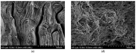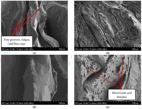FESEM micrographs showing the fracture surface of minimum–maximum parameter S1-T1 (430 °C/60 min) and S9-T1 (530 °C/120 min): (a) S1-T1 (430 °C/60 min); (b) S1-T1 (430 °C/60 min); (c) S1-T1 (430 °C/60 min); (d) S9-T1 (530 °C/120 min); (e) S9-T1 (530 °C/120 min); and (f) S9-T1 (530 °C/120 min).