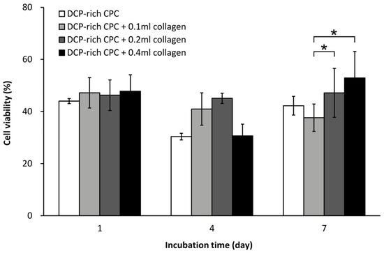 Cell viability of D1 cells seeded on different DCP-rich CPC samples after days 1, 4, and 7 of incubation (n = 3). * p < 0.05.