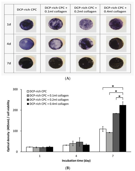 As shown in Figure 3A, the DCP-rich CPC group had the darkest staining at day 1. However, from day 4 to day 7, DCP-rich CPC with collagen samples showed darker blue staining than the control sample. The above mentioned results could be further verified by ALP semi-quantitative comparison per cell. Figure 3B shows the ALP absorbance values and ALP activity per cell were higher with the DCP-rich CPC supplemented with collagen than with the DCP-rich CPC alone for the different culture durations. Notably, ALP activity of the DCP-rich CPC supplemented with 0.1 mL collagen was not significantly different from that of the control at all measured time points, suggesting insufficient dosage of type I collagen. ALP activity of the DCP-rich CPC supplemented with 0.4 mL collagen was significantly increased from 23% on day 1 to 224% on day 7, and the measured activity was significantly different from that of the control on day 7. Early expression of ALP activity on the DCP-rich CPC supplemented with 0.4 mL collagen was not significantly different from the control on days 1 and 2.
