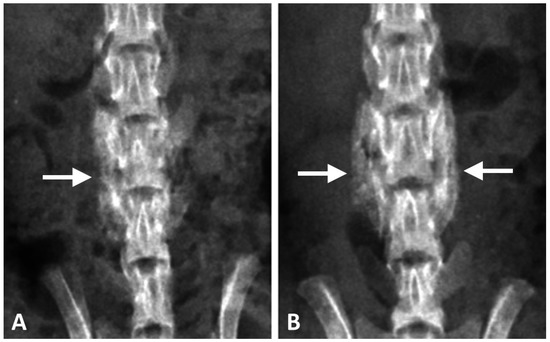Posteroanterior radiographs after post-operative four weeks of the spines that underwent posterolateral lumbar fusion with (A) DCP-rich CPC or (B) DCP-rich CPC + 0.4 mL collagen. The arrows indicate fusion mass.