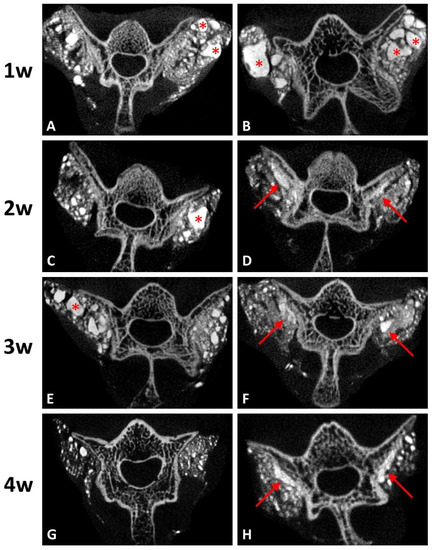 Coronal micro-CT images of the lumbar spines. (A,C,E,G) represent post-operative 1–4 weeks of DCP-rich CPC only, respectively. (B,D,F,H) represented post-operative 1–4 weeks of the DCP-rich CPC supplemented with 0.4 mL collagen, respectively. The star symbols indicate residual grafts and the arrows indicate callus formation.