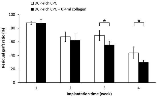 Residual graft volume of both sides was measured through the contrast of the image in Figure 5. The residual graft ratio was significantly different between the control group and the DCP-rich CPC supplemented with 0.4 mL collagen group at three and four weeks after implantation (Figure 6). Notably, the residual graft ratio of the DCP-rich CPC supplemented with 0.4 mL collagen group was reduced to 55% at three weeks and 30% at four weeks. Meanwhile in the control group, the residual graft ratio was 70% at three weeks and 50% at four weeks. The residual graft ratio in the DCP-rich CPC supplemented with 0.4 mL collagen group was significantly lower than that in the collagen-free DCP-rich CPC group at both three and four weeks postoperatively (p < 0.01).