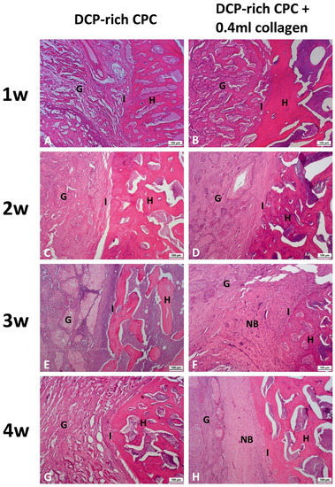 Representative histological coronal sections between the L4 and L5 transverse processes stained with haemotoxylin and eosin. (A,C,E,G) represented 1–4 weeks post-surgery of DCP-rich CPC group (100×). (B,D,F,H) represented 1–4 weeks post-surgery of DCP-rich CPC supplemented with 0.4 mL collagen group (100×). Scale bar = 100 μm. Abbreviation: G, implanted graft; H, host bone; I, interface between host bone and implanted graft; NB, new bone formation.