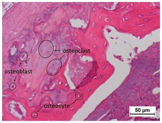 Representative histological image between the L4 and L5 transverse processes stained with haemotoxylin and eosin at four weeks post-surgery of the DCP-rich CPC supplemented with 0.4 mL collagen (200×). Osteoblasts are single-nucleus cells, found on the surface of bones, and separated from each other by their underlying matrix. Osteoclasts are characterized as large cells with multiple nuclei and ‘foamy’ cytosols. Scale bar = 50 μm.