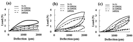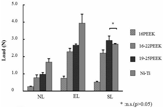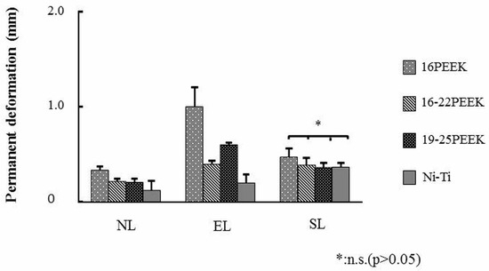 Higher bending loads were obtained for EL and SL. The load deflection curves were similar among the Ni-Ti and PEEK wires except for 16PEEK with EL and SL (Figure 1b,c). For EL (Figure 1b), the Ni-Ti wire also showed a higher bending load than that of all three PEEK wires, and 16PEEK showed a lower bending load as compared to the other two PEEK wires (p < 0.05). A slight amount of permanent deformation was observed for the Ni-Ti wire, and a greater degree of permanent deformation was observed for all three PEEK wires. SL showed different load-deflection curves as compared to EL (Figure 1c). The bending force of 19-25PEEK wire was comparable with that of Ni-Ti wire. 16PEEK showed a lower bending load among the three PEEK wires. The degree of permanent deformation was almost the same for Ni-Ti and all three PEEK wires.