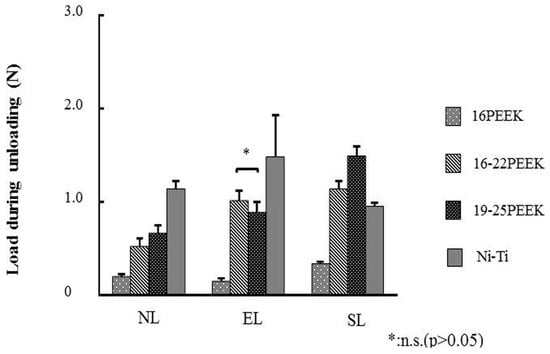 The load at the deflection of 1500 μm during unloading was evaluated (Figure 3). This load corresponds to the force for tooth movement in orthodontic treatment. Ni-Ti wire showed the highest load at the deflection of 1500 μm for NL and EL (p < 0.05).