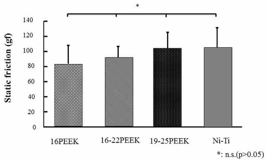 Figure 6 shows the static friction for each wire. No significant difference in static friction existed among all three PEEK wires and the Ni-Ti wire (p > 0.05).