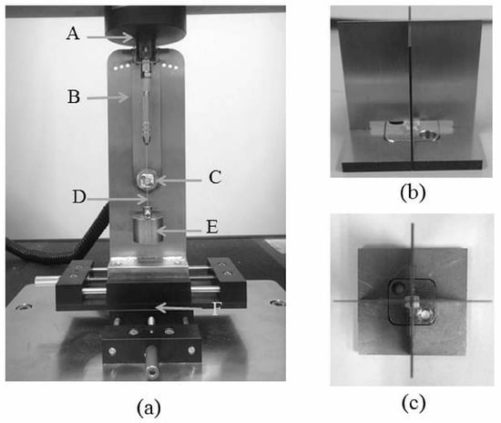 Measurements of the static friction between the orthodontic wire and the bracket were performed according to previous reports in the system shown in Figure 12 [26,27,34]. Each bracket was bonded accurately to the center of a stainless steel plate with unfilled adhesive resin (Superbond Orthomite, Sun Medical, Shiga, Japan) by using the bracket-mounting device shown in Figure 12b,c. The plate was then attached to the custom-made friction testing device, indicated by C in Figure 12a, and connected to a universal testing machine (Instron 5565, Instron Japan, Kanagawa, Japan). The adjustment plate was positioned by pushing a pin through the holes within that plate and the base plate B in Figure 12a.