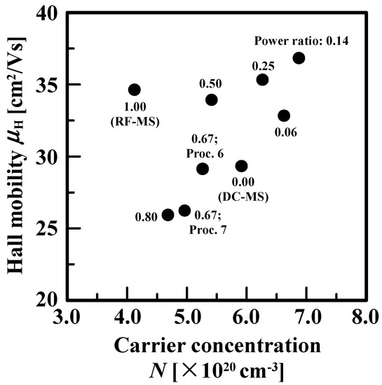Figure 1 shows μH as a function of N of 500-nm-thick AZO films deposited by DC magnetron sputtering, RF/DC magnetron sputtering at various power ratios, and RF magnetron sputtering. The nine different deposition processes carried out at various power ratios are summarized in Table 1 [15]. DC magnetron sputtering (Proc. 1) and RF magnetron sputtering (Proc. 9) were conducted at a DC power (PDC) of 200 W and an RF power (PRF) of 200 W, respectively. The RF/DC magnetron sputtering processes, from Proc. 2 to Proc. 8, were carried out by adding an RF component in the power range from 10 to 200 W to an applied PDC in the power range from 50 to 150 W. Details of the various power ratios of PRF to the total power (PRF + PDC) are given in Table 1. From Figure 1, we found that an increase in N appear to tend to an increase in μH of AZO films except for AZO films deposited by RF magnetron sputtering. Note that AZO films deposited at a power ratio of 0.14 showed the highest N and μH. Note that the averaged Al concentrations in depth for each of the AZO films were estimated from about 6.2 × 1020 to 6.6 × 1020 atoms/cm−3 on the basis of analysis of the data determined by secondary ion mass spectrometry (SIMS) measurements. The concentration of Al donors in the AZO films was found to remain almost constant from the film/substrate interface to the surface, regardless of the deposition process. Those findings implies that the above change in N would be due to the dependency of carrier activation efficiency of Al donors in grains and/or incorporation of Al atoms in crystallites and at grain boundaries, which would affect the carrier transport in polycrystalline films, on the RF/DC power ratios.