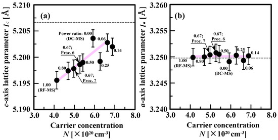 Relationship between (a) c-axis lattice parameter (lc) or (b) a-axis lattice parameter (la) and carrier concentration (N) of 500-nm-thick AZO films deposited by DC magnetron sputtering (DC–MS), RF/DC magnetron sputtering at various power ratios and by RF magnetron sputtering (RF–MS).