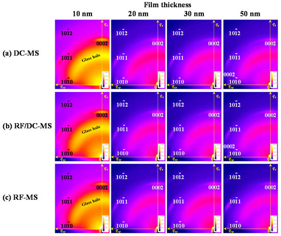We characterize the evolution of the crystallographic orientation of AZO films with various thicknesses ranging from 10 to 50 nm deposited by DC, RF/DC, or RF magnetron sputtering at various power ratios. Figure 3a–c show the two-dimensional diffraction images of AZO films with thicknesses of 10, 20, 30, and 50 nm deposited by DC magnetron sputtering and RF/DC magnetron sputtering at a power ratio of 0.14, and by RF magnetron sputtering, respectively. qz and qxy are the stacking direction and in-plane direction, respectively. Signals of multiple reflections on the qz axis in Figure 3 are these from crystallites being tilted and deviated from the surface normal direction. More details are given in a previous technical article [39]. All figures show peaks of the , , and reflections and 0002 reflection on the qz axis, which originated from the (0001) orientation, even though the 10-nm-thick AZO films were very thin. These results clearly showed that AZO films had a preferential (0001) orientation texture at the very early stage of their growth. We, however, assumed that both the DC- and RF-superimposed-DC magnetron-sputtered AZO films would include some crystallites with a very small amount of orientation in addition to the (0001) orientation at the early stage of their growth. This assumption is based on the following experimental results on the evolution of several reflections observed for AZO deposited by DC magnetron sputtering and AZO films deposited by RF/DC magnetron sputtering as follows. We found little difference in two-dimensional diffraction images among AZO films deposited by RF magnetron sputtering, DC magnetron sputtering, and RF/DC magnetron sputtering at any given thickness ranging from 10 to 30 nm. On the other hand, in case of 50 nm thicknesses, we found distinct differences in two-dimensional diffraction images among the RF-, DC- and RF-superimposed-DC magnetron-sputtered AZO films: Figure 3a,b presented that AZO films deposited by DC magnetron sputtering or RF/DC magnetron sputtering showed another 0002 reflection. The 0002 reflection corresponds reasonably well with the reciprocal space map simulation in Figure A2a. This means that the two different types of 50-nm-thick AZO films consistently showed a unique texture with the orientation in addition to the (0001) orientation. On the other hand, for the RF-magnetron-sputtered AZO films shown in Figure 3c, we found no significant difference in the reflection images among the films with thicknesses ranging from 10 to 50 nm. Therefore, we concluded that 10-nm-thick AZO films deposited by RF magnetron sputtering showed a highly textured (0001) orientation. The characteristics of the above orientation distribution of RF-magnetron-sputtered AZO films with increasing thickness up to 50 nm should be retained with further increasing thickness.