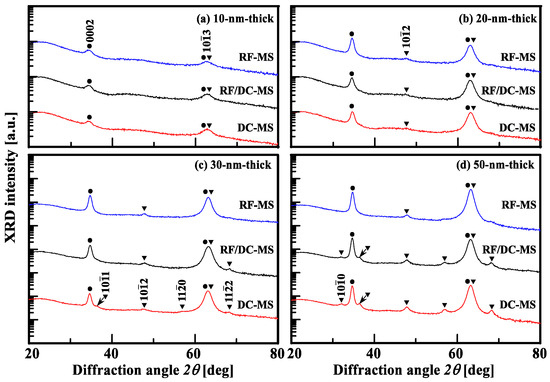 As shown in Figure 4a, the analysis of the data obtained by the out-of-plane grazing-incident XRD measurements of 10-nm-thick AZO films deposited by DC magnetron sputtering, RF/DC magnetron sputtering or RF magnetron sputtering showed predominant 0002 and reflections. Figure 4b showed that with increasing thickness up to 20 nm, the AZO films exhibited also a barely resolvable reflection together with the 0002 and reflections regardless of the deposition process. From Figure 4c,d, we found that with increasing thickness up to 50 nm, RF-magnetron-sputtered AZO films retained the above-described three reflections: the AZO films with different thicknesses had a common feature of well-defined (0001) orientation. On the other hand, for 50-nm-thick AZO films deposited by DC magnetron sputtering or RF/DC magnetron sputtering, the , , , and reflections were also observed in addition to the above-described three peaks. The two different types of AZO film may include a small number of crystallites with the orientation in addition to those with the (0001) orientation at the early stage of film growth.