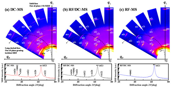We carried out out-of-plane grazing-incident XRD measurements [15,16,17,18] to demonstrate a significant difference in the film growth among AZO films deposited by the three different types of magnetron sputtering methods mentioned above. Figure 4 shows the out-of-plane grazing-incident XRD patterns of the same films as those shown in Figure 3. The solid black circles (●) and the solid black inverted triangles (▼) correspond to the contributions of (0001) and orientations, respectively. The origins of reflections observed in the out-of-plane grazing-incident XRD measurement results (Figure 4) can be determined as follows: (I) the 0002 reflection, which corresponds to a component that originated from the (0001) orientation, can be observed owing to the tilting of the c-axis, as shown on the right side of Figure A2a; (II) , , , , and reflections are components that originated from the orientation owing to the tilting of columnar grains with the orientation; (III) the reflection corresponds to the trajectory of Q, as shown in Figure A2a, when films have a (0001) orientation and/or an orientation.
