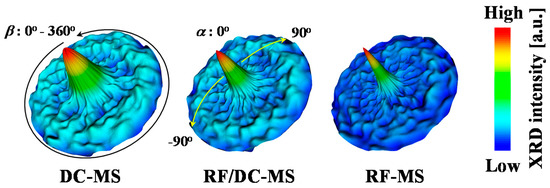 Three-dimensional projections of XRD pole figures of 0002 reflection of 500-nm-thick AZO films deposited by DC magnetron sputtering (DC–MS), RF/DC magnetron sputtering at a power ratio of 0.14 and by RF magnetron sputtering (RF–MS).