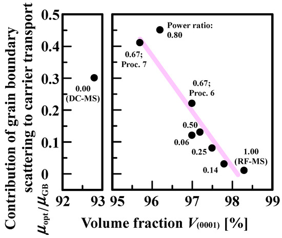 On the basis of the above findings, let us consider the relationship between V(0001) and the carrier transport of AZO films deposited at various power ratios. In our previous work, we reported that the μopt of these films changed slightly with power ratio, whereas μH was mainly governed by the contribution of grain boundary scattering to carrier transport defined as the ratio of μopt to μGB (μopt/μGB); μopt/μGB strongly depended on power ratio [14,15,16,17]. For the AZO films having a texture with a well-defined (0001) orientation, the degree of alignment between columnar grains would predominantly determine μopt/μGB. In such films, taking into account the finding that the peak of the 0002 reflection corresponds to a combination of planes to the surface, which consequently holds information about the out-of-plane misorientation of domains (tilt), the mean FWHM of the peak would be an important factor for the relationship between the orientation distribution and μopt/μGB.