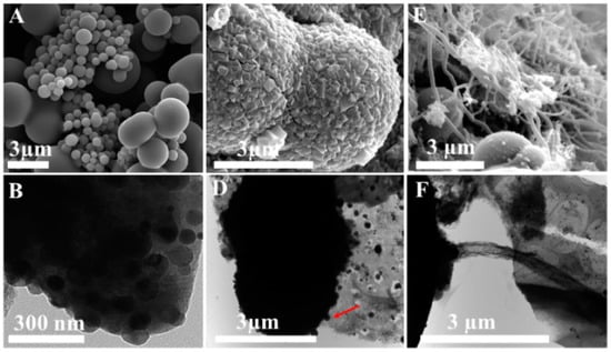 (A) SEM image of GAL-Fe-HT prepared using the hydrothermal process combining galactose and FeMNPCs; (B) TEM image confirming interior spheres were embedded with FeMNPs; (C) SEM image of GAL-Fe-HT pyrolysed at 650 °C with melamine; (D) TEM image of diffusion of FeMNPs from the sphere pyrolysed at 950 °C with melamine (red arrow FeMNPC); (E) SEM image of final composite material (GAL-Fe-N) with integrated N-doped carbon microspheres and N-CNT; and (F) TEM image of CNT forming from the FeMNPC within the sphere.
