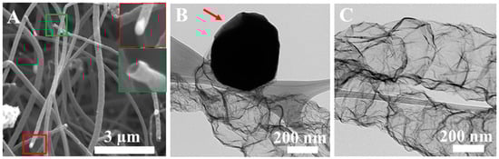 SEM image of (A) carbon nanofibers; the inset red and green outlines are the FeMNPCs attached to the tip of the tube and the cross section of a hollow nanotube, respectively; TEM image of (B) formation of a CNT from a FeMNPC, red arrow shows the utilised area of carbon precursors and (C) hollow corrugated CNT.