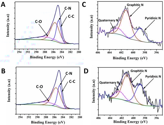 (A,B) are the XPS spectra of the deconvoluted C1s region; and (C,D) are the deconvoluted N1s region of GAL-N and GAL-Fe-N, respectively.