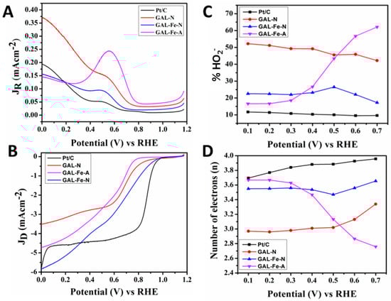 Rotating ring disc voltammograms recorded with GAL-N, GALFe-A, GALFe-N and Pt/C electrodes. (A) Ring current; (B) disc current; (C) HO2− peroxide produced (%) against applied potential; and (D) number of total electrons transfers against applied potential.
