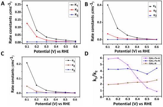The rate constants for (A) GAL-N; (B) GAL-Fe-A; (C) GAL-Fe-Nis in the potential range of 0.1 V to 0.6 V; and (D) Comparison of k1/k2 ratio for GAL-N, GAL-Fe-A and GAL-Fe-N.