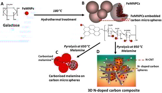 Schematic for the synthesis of the 3D N-doped carbon composites with combined N-doped microspheres and N-CNT. (A) Galactose and FeMNPs dispersed in water; (B) carbon microsphere formation with FeMNPC embedded (GAL-Fe-HT); (C) carbonised melamine associated with microspheres at 650 °C; (D) carbon nanotubes are formed from the diffused FeMNPC catalysts, forming the composite material (GAL-Fe-N).