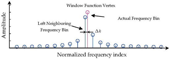 Additionally, we define the following useful concepts of frequency error (FE) with its normalized version when the digital signal is segmented with a specific type of window function. According to the fundamentals of signal processing, the actual single tone harmonic component is associated with the point with the maximal modulus in the spectral domain. We also name such a point a window vertex. Window vertexes may not be available in the fast Fourier Transform (FFT) spectrum because FFT only provides spectral bins evenly spaced at the spectral resolution . As a result, frequency error, defined as the error between the actual frequency value and the frequency of its left neighboring spectral bin, occurs. This phenomenon can be observed in Figure 1. FE can be mathematically described as