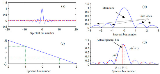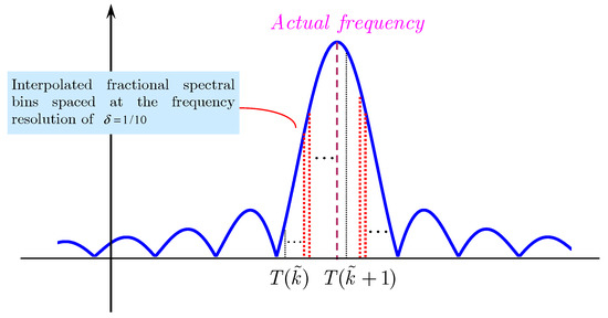 The normalized frequency width of a main lobe is . As such, for a sinusoidal component without exact positive period sampling, the accurate information of amplitude, frequency, and phase can be retrieved using the two neighboring spectral bins located within the main lobe around the actual frequency, which is shown in Figure 2.