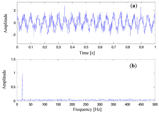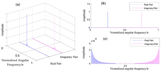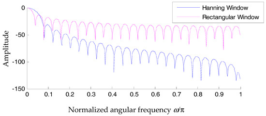 From Figure 4, it is inferred that the main lobe bandwidth of the Hanning window is greater than that of the rectangular window. However, the magnitude of the side lodes of the latter decays much faster. Considering a simple harmonic signal whose frequency is exactly , where is the sampling frequency, we can express the associated signal as