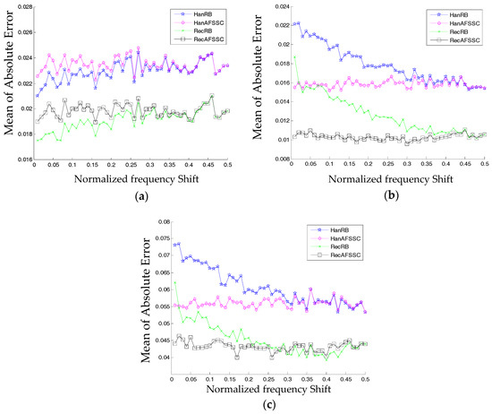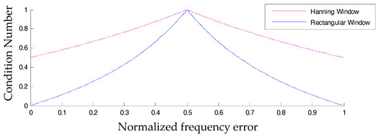 As indicated in Figure 7, the condition number of either type of window reaches the global maximum at . This means that in such a situation, both of the two neighboring spectral bins around the actual frequency are high in amplitude. However, for the Hanning window, there are always two spectral bins relatively low in amplitude. Owing to these facts, we attempt to propose a novel active frequency shift spectral correction method based on a rectangular window.