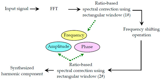 The above procedure can be divided into two parts. Step 6 refers to the active frequency shifting operation, which is capable of enhancing the noise resistibility of spectral bins in the subsequent spectral correction steps. Step 7 is the classical spectral correction using a rectangular window. It should be mentioned that the information of frequency is corrected prior to the frequency shifting operation and the information of amplitude and phase is estimated after the frequency shifting operation, as illustrated in Figure 8. Reasons for the proposed algorithm are explained in Section 4.