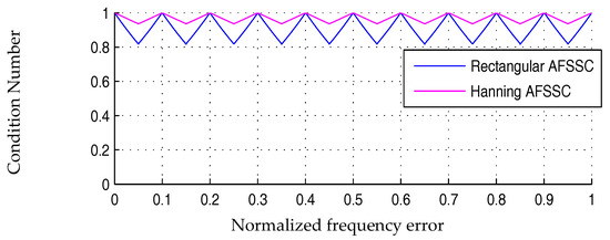 In the above definitions, the operator computes the modulus of a complex-valued Fourier coefficient and the notation means eliminating the spectral bin with the maximal modulus form the original set. For a sinusoidal tone signal whose frequency is located near and does not belong to FFT grids, the plots of condition numbers regarding the two window functions with respect to are displayed in Figure 7. As the condition number approaches unity in value, MLSBs have similar amplitude.
