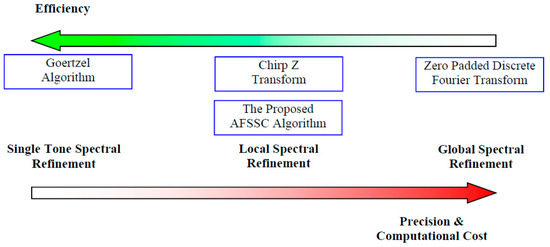 To achieve good spectral correction performance in low signal-to-noise (SNR) conditions, some comparatively classical methodologies turn out to be very effective. These methodologies include zero-padded discrete Fourier transform (DFT) [34], the chirp Z-transform [35], and the Goertzel algorithm [36]. Zero-padded discrete DFT can be implemented via the algorithm of FFT, and it generated interpolated spectral bins across the entire frequency domain, therefore deriving information with high precision. However, the resulting accuracy is determined by the number of padded zeros. In some applications, the padded zeros may be hundreds or thousands of times that of the original signal in length. Chirp Z transform is similar to zero-padded DFT in its mathematical principle. Similarly, chirp Z transform can also approximate the continuous spectrum via interpolated spectral bins in a specific spectral range of interest. Chirp Z transform can be very time-consuming because computations of discretized spectral interpolation on the unit-circle in the Z plane must rely on the original DFT algorithm. The Goertzel algorithm is very efficient in calculating information of signals of single tone harmonic component. However, the precise frequency information should be available as prior knowledge for the Goertzel algorithm; otherwise it still demands a lengthy calculation period. To improve the efficiency of the above conventional algorithms, we propose an enhanced spectral correction method.