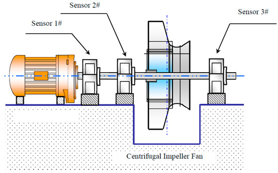 As shown in Figure 18 and Figure 19, as the key component of the booster fan, the centrifugal compressor is driven by an AC motor via a rigid coupling. There are three bearing housings from the end of the motor output to the right end of the centrifugal compressor. Vibration sensors were deployed on the bearing housings due to the convenience of accessibility. In each sensor point, vibrations in three directions (axial, horizontal, and vertical) were measured. Signals collected from the axial directions are acceleration signals and signals from the horizontal direction are velocity signals. The acronym GE in Table 5 refers to the envelope amplitude of acceleration signals. It was acquired via hardware integrations in the data acquisition appliance. Because location 2 and location 3 are closer to the centrifugal compressor, we focus on analyzing the signals collected from them.