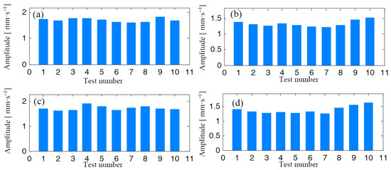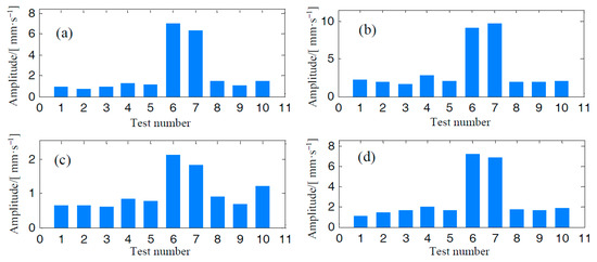 To investigate the historical measurements of this faulty booster fan, the collected vibration signals stored in the factory database were checked. There are 10 sets of historical data that can be traced. The data, along with the scheme of each measurement, are listed in Table 5. The earliest test was conducted about 11 months before the accidental event. For the historical measurements, the booster fan operated at the lower speed (744 r/min, indicated by letter ‘L’) eight times and the higher speed (993 r/min, indicated by letter H) two times. Because their working speeds are not exactly the same, this adds to the difficulty of the signal analysis. Among these measurements, the sample frequency and the sampling length in each channel are uniformly set at and .