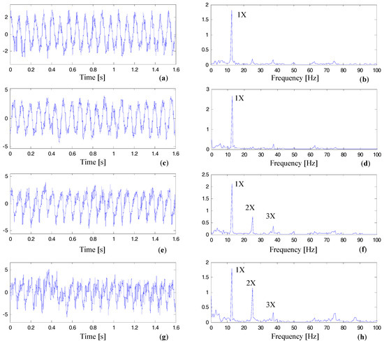 Time domain waves and FFT spectra of the vibration signal belonging to sensor point 3H: (a) the time domain wave of Test No. 2, (b) Fourier spectra of Test No. 2, (c) the time domain wave of Test No. 4, (d) Fourier spectra of Test No. 8, (e) the time domain wave of Test No. 8, (f) Fourier spectra of Test No. 8, (g) the time domain wave of Test No. 10, (h) Fourier spectra of Test No. 10.