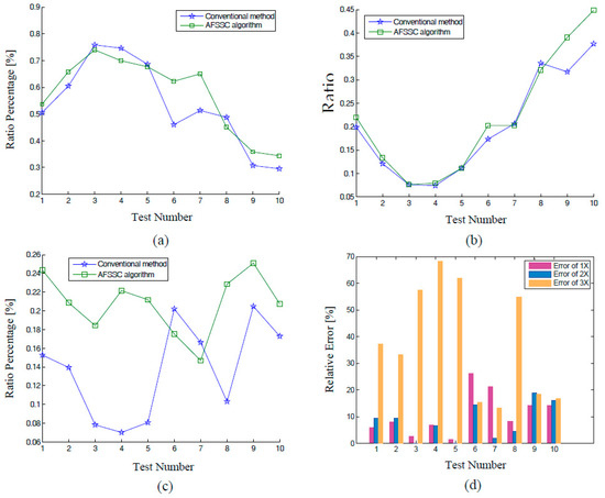 In the early tests, the amplitude of the components 2× and 3× are low in energy, therefore the error between and is relatively small, as can be observed in Figure 24a,b. As the crack on the impeller blade developed, the differences became much greater in later tests. It should be noticed in Figure 24b that the curve of the energy weight of 2× no longer exhibits a monotonic increasing trend, which suggests the occurrence of a large estimation error. In Figure 24c, the difference between and is so large that the results of regarding the harmonic component 3× are not accurate at all. Moreover, we plot curves of relative error with respect to each harmonic tone of each test (Figure 24d).