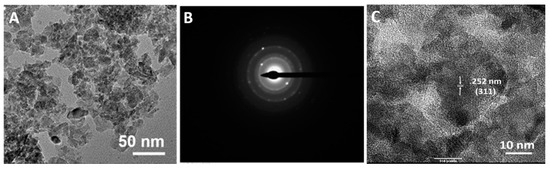 (A) Transmission electron microscope (TEM) image of Magnesium ferrite (Mg-ferrite) nanoparticles at lower magnification; (B) Corresponding selected area diffraction pattern; and (C) TEM image of Mg-ferrite nanoparticles at higher magnification.